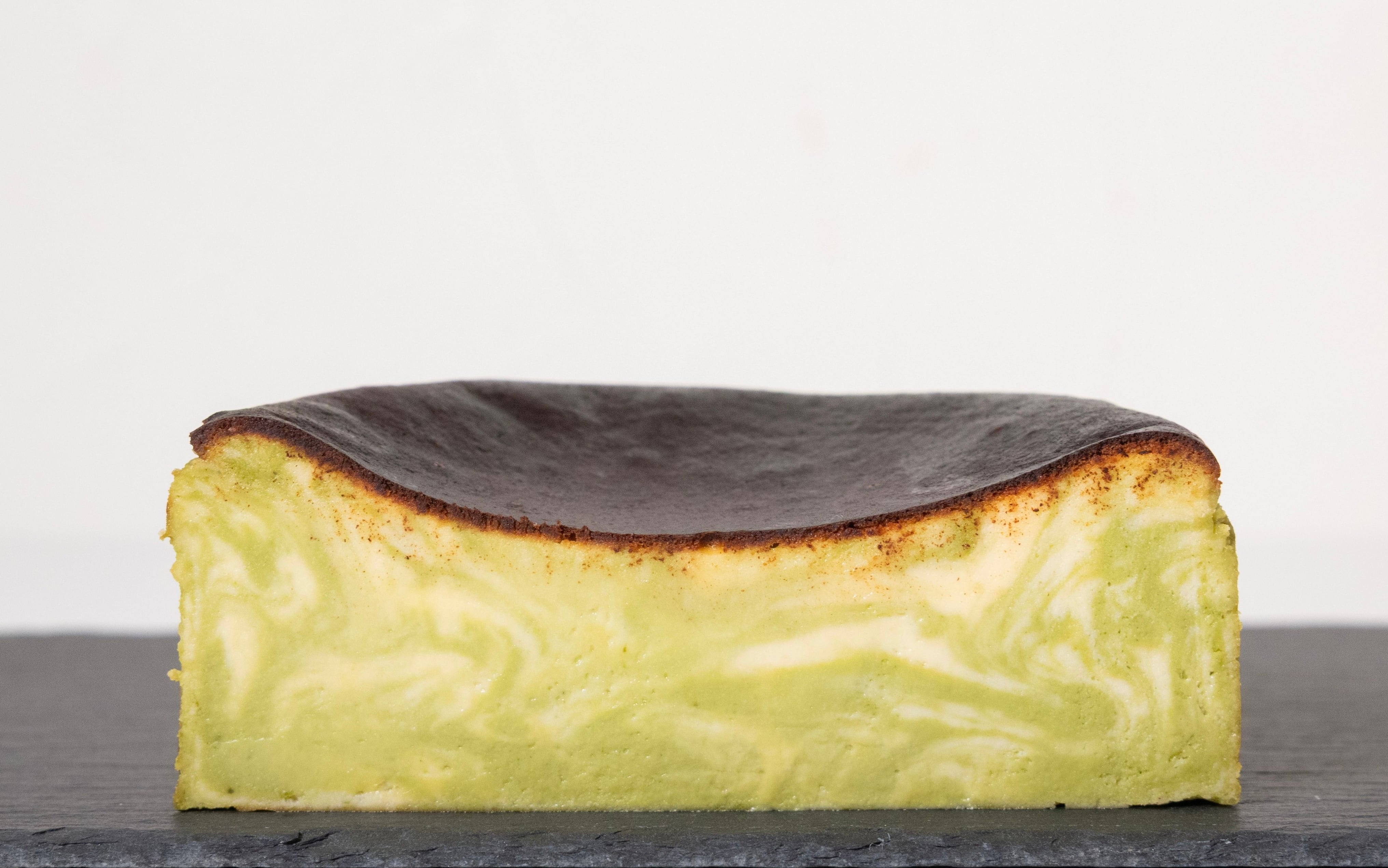グリーンスノーバスクチーズケーキは、抹茶とホワイトチョコを贅沢に組み合わせた、クリスマスカラーの特別なチーズケーキです!