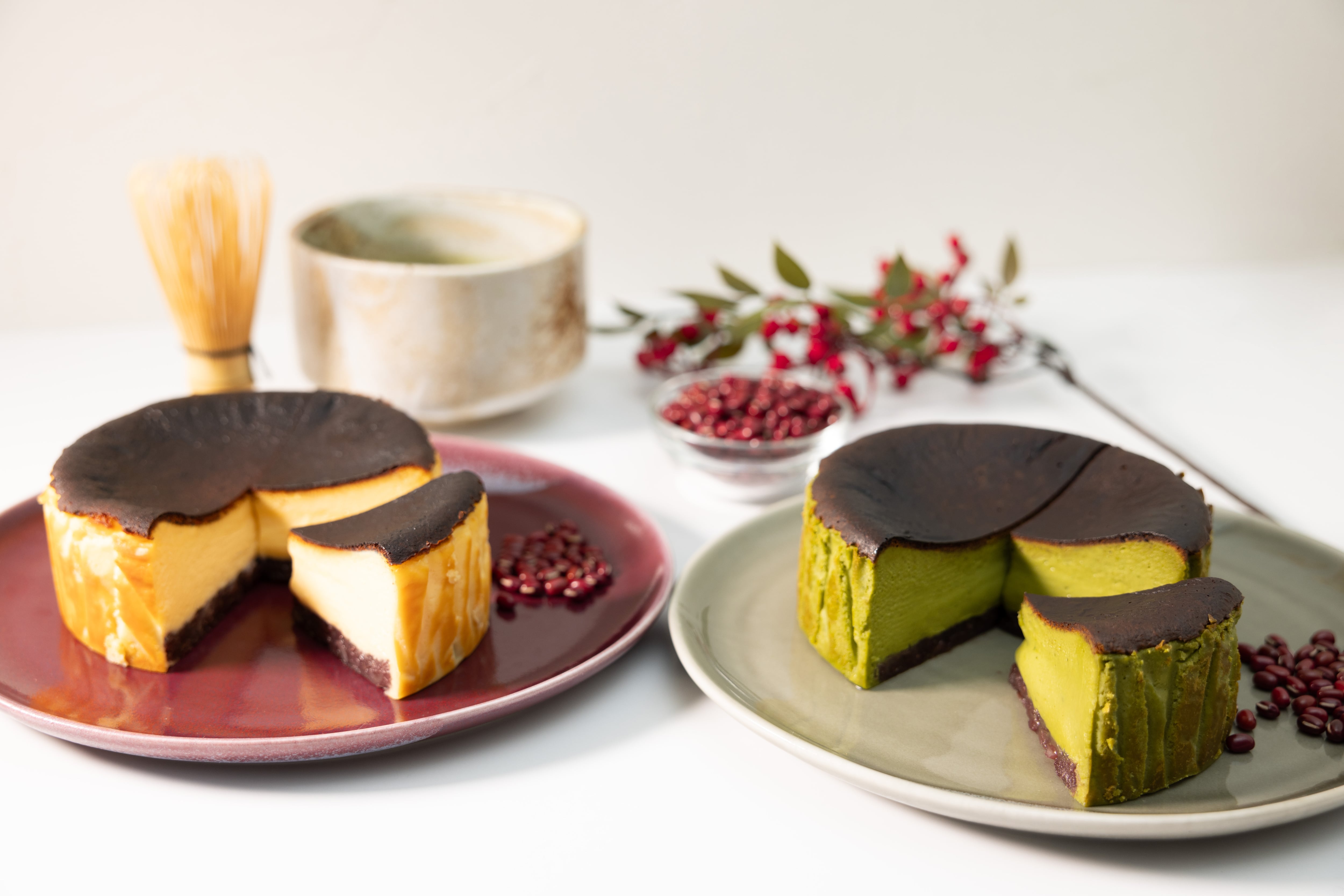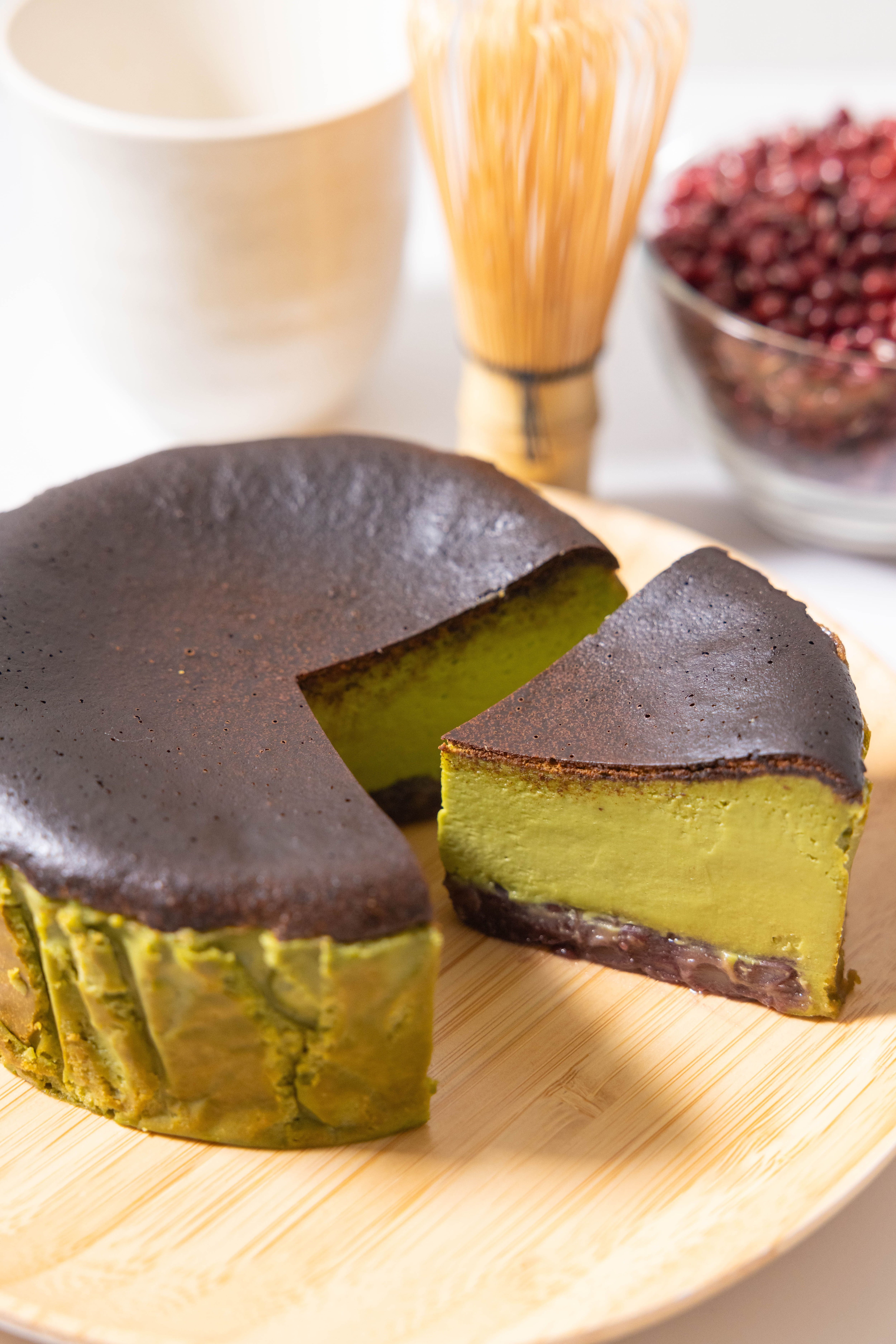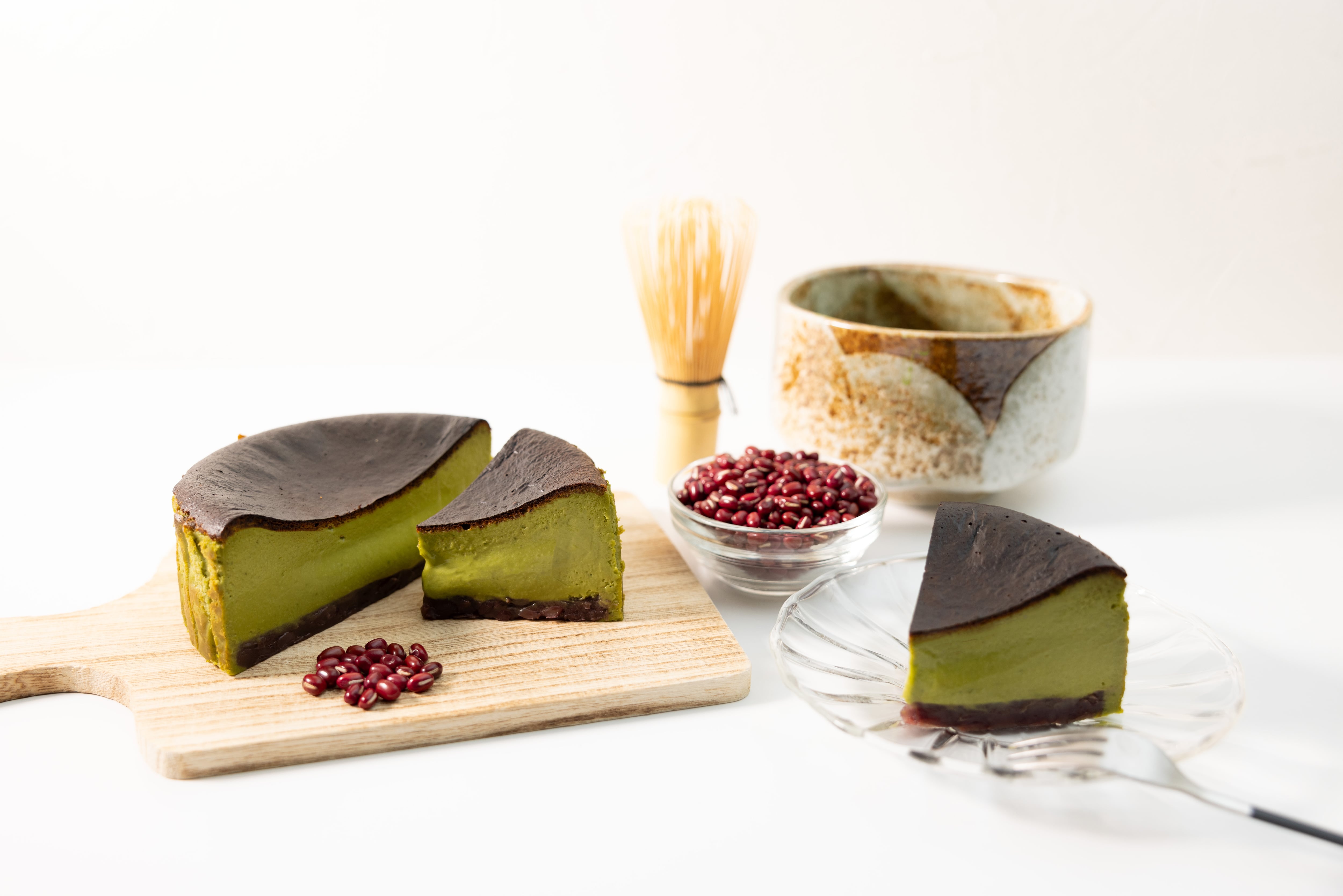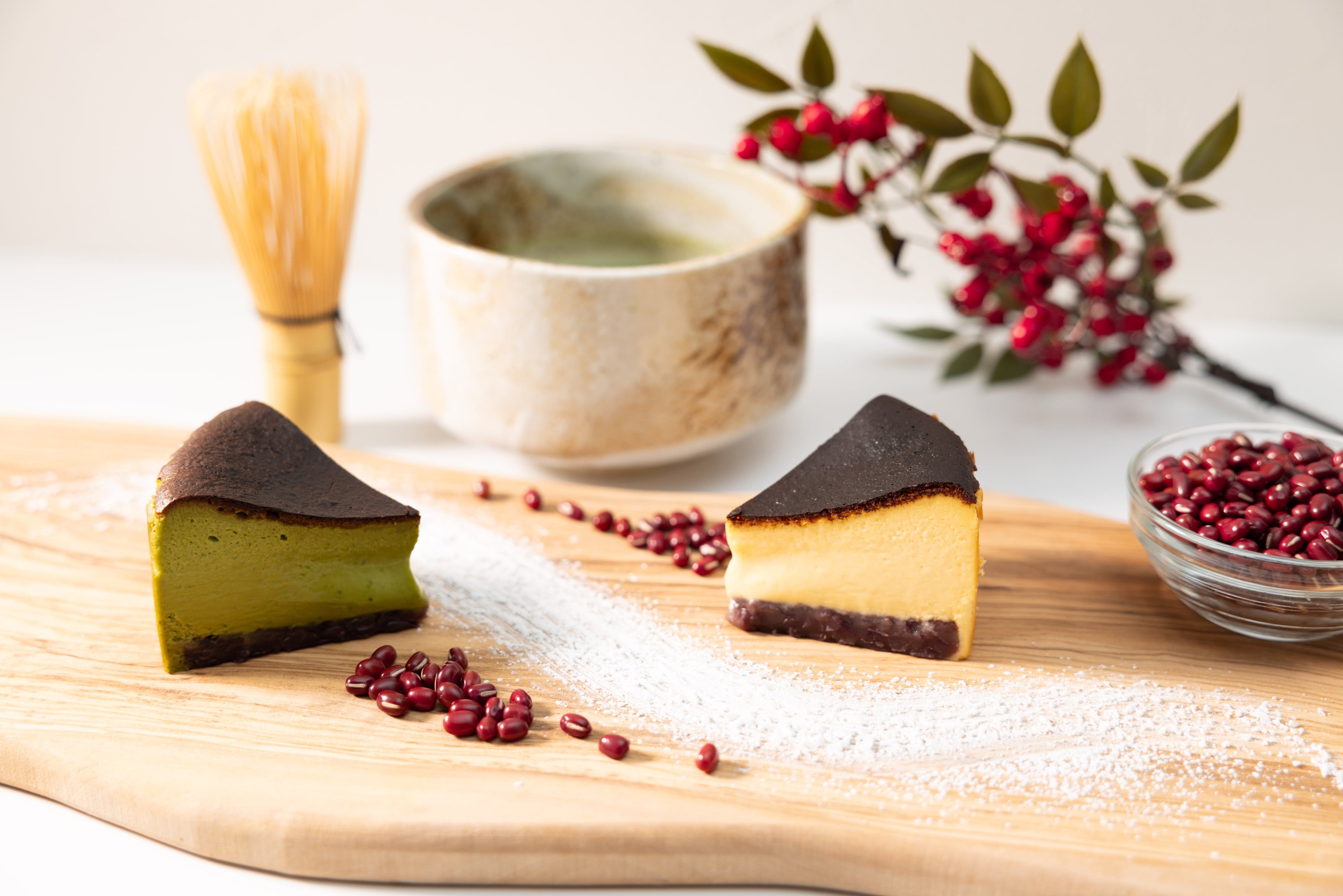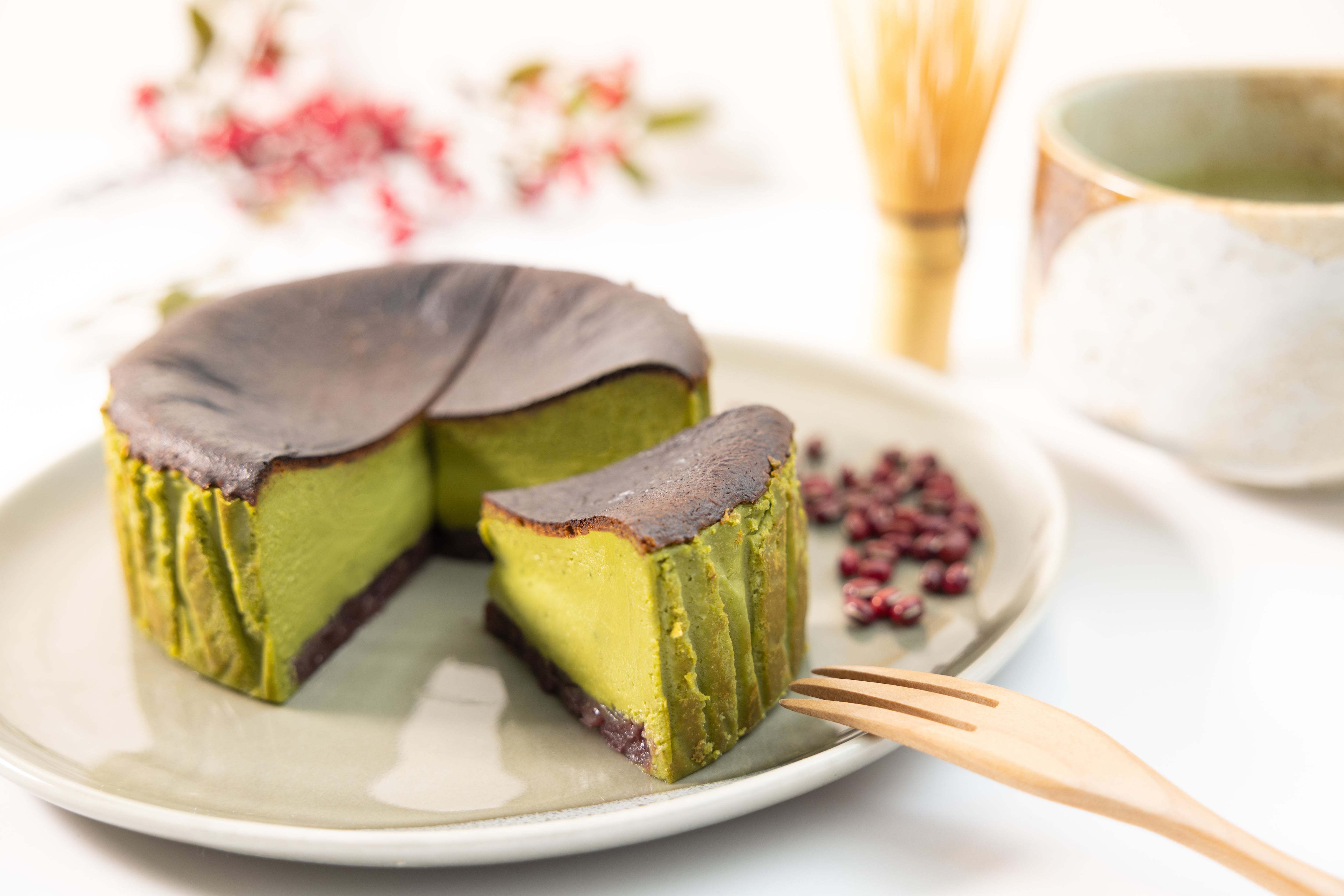 通常の抹茶バスクチーズケーキに北海道産の上質な粒餡を掛け合わせたチーズケーキとなります。